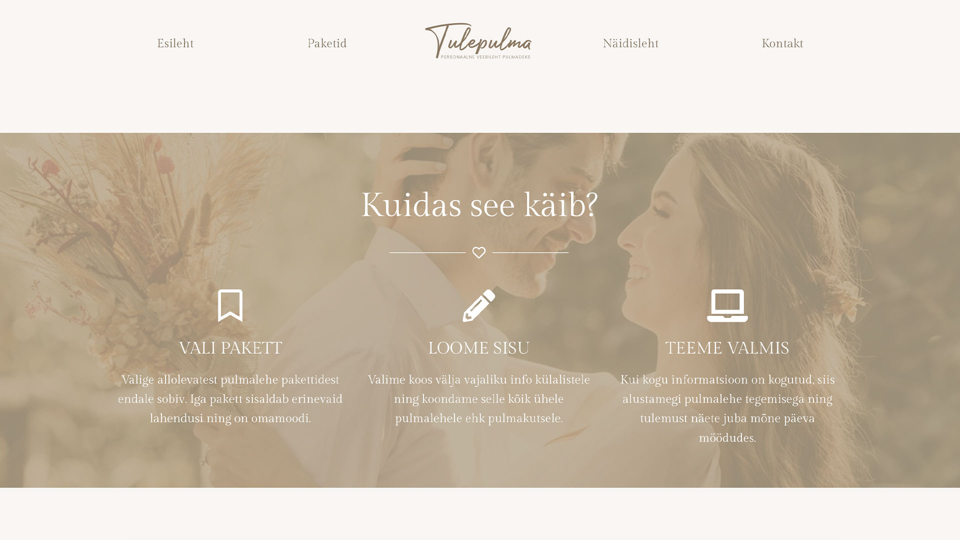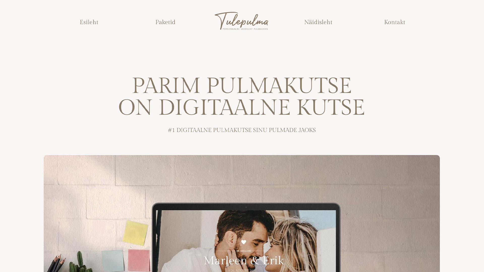 Tulepulma.ee on kaasaegne veebileht, mis asendab tavalise paberist pulmakutse. See on koht, kuhu saad koondada kogu info: asukohad, kellaajad, kingisoovid ja galerii. Nii on külalistel alati värske info käepärast.